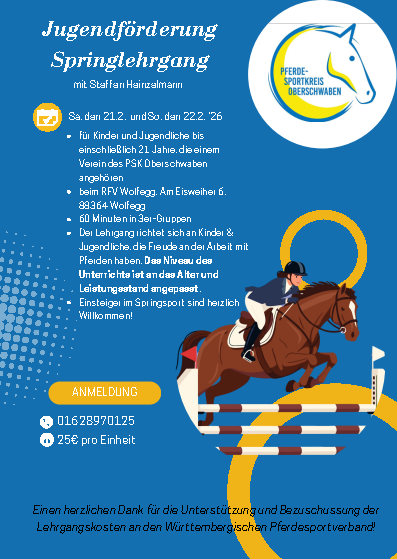 Am 21. und 22. Februar 2026 findet beim RFV Wolfegg der Jugendförderung Springlehrgang mit Steffen Heinzelmann statt!